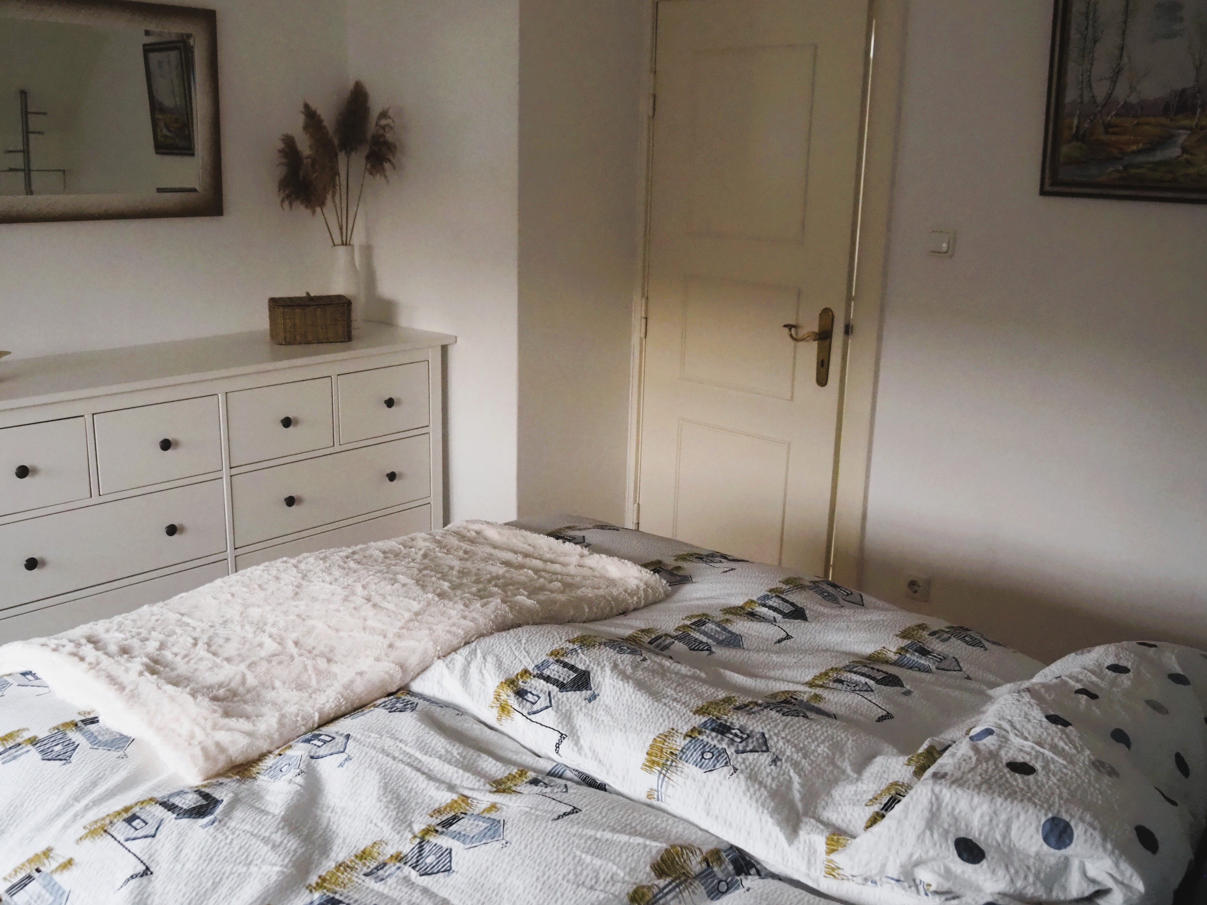 Ausgestattet mit Doppelbett, Kommode, Kleiderstange, Spiegel sowie Sessel.